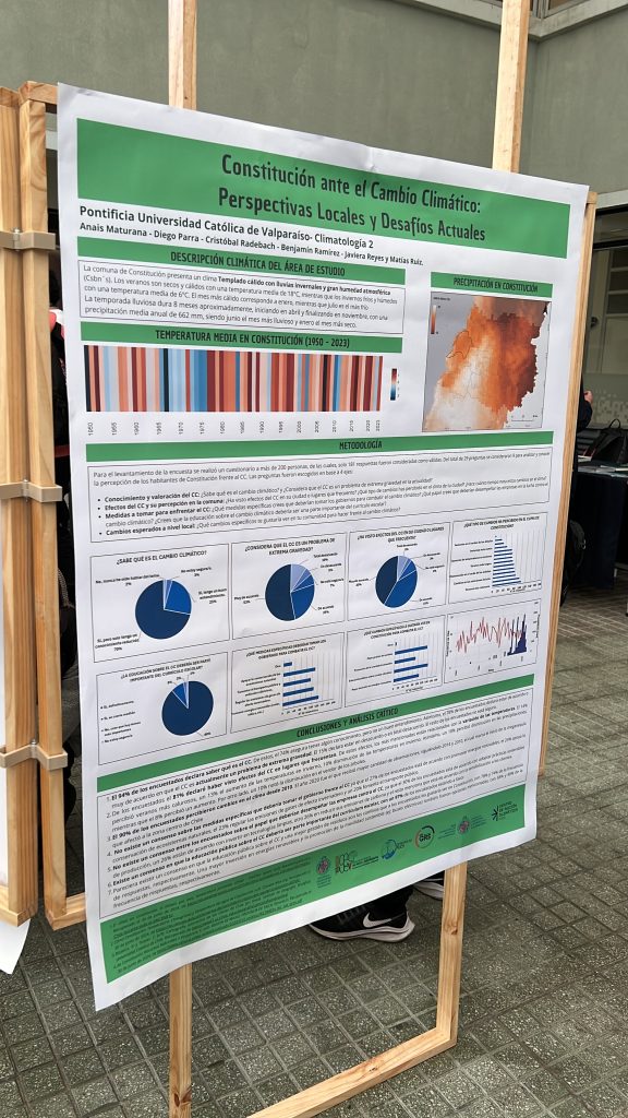 Para dar a conocer los resultados del proyecto y transferir los conocimientos, se realizaron instancias de divulgación. En primer lugar, se presentó en el «Encuentro Nacional de Estudiantes de Geografía (ENEG): Cambio Climático y conflictos socioambientales» desde el 8 al 11 de octubre de 2024. En segundo lugar, se presentó en la “1ra Feria de Acción Climática” organizada por el Centro de Acción Climática de la PUCV el 24 de octubre de 2024. La última instancia se abordó de manera conjunta con la Municipalidad de Constitución, durante la jornada de cierre del proyecto, en las dependencias del Instituto de Geografía el 22 de noviembre del mismo año.